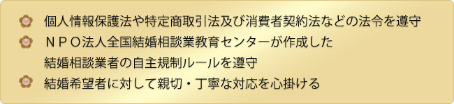 上記を満たした仲人(結婚相談従事者)を、NPO法人全国結婚相談業教育センターが「仲人士」として認定しています。 仲人士資格保持者ということで、結婚希望者は安心して入会し、サービスを受けることができます。